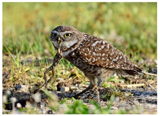 - Johnston, D. Breakfast with the Burrowing Owls. Available online: https://dinascitywildlife.com/2012/04/21/breakfast-with-the-burrowing-owls/ (accessed on 4 June 2021).