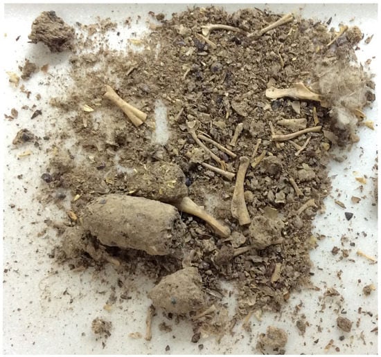 - De Cupere, B.; Thys, S.; Van Neer, W.; Ervynck, A.; Corremans, M.; Waelkens, M. Eagle owl (Bubo bubo) pellets from Roman Sagalassos (SW Turkey): Distinguishing the prey remains from nest and roost sites. Int. J. Osteoarchaeol. 2008, 19, 1–22. [Google Scholar] [CrossRef]