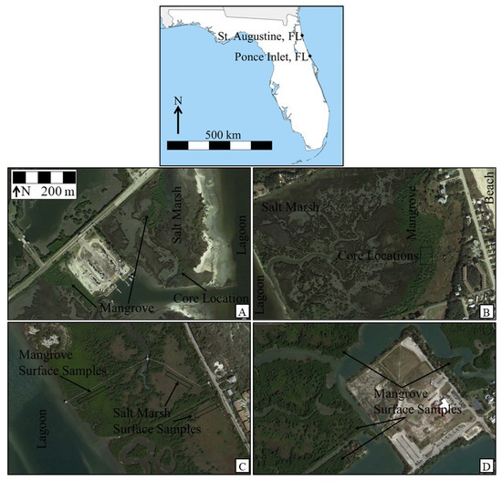 The primary, guiding objective of this study was to elucidate past shifts of the salt marsh/mangrove ecotone over longer timescales in order to evaluate decadal- to centennial-scale variability. Intertidal wetlands, including salt marshes and mangroves, accumulate mineral and organic sediments that potentially reveal information about past environments [24,25,26]. Surface soil samples were collected from extant salt marsh and mangrove environments around the historic transition zone near Ponce Inlet, FL, and proxy indicators were employed to establish a fingerprint for each type of environment. These indicators were applied to a series of sediment cores recovered from near the current northern limit of significant black mangrove stands near St. Augustine, FL, in order to apply the proxy indicators to ancient sediment deposits and also begin to test for the presence of past mangrove deposits near the current northern limit. Measured proxy indicators also allowed for the determination of long-term carbon sequestration rates.
