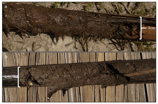 Surface sediment samples collected from salt marsh and mangrove environments showed significant differences (p < 0.01) in water content, loss on ignition, bulk density, carbon percentage, and δ13C (Table 1). In addition, salt marsh surface sediments contained abundant grassy fragments, whereas mangrove surface sediments contained woody material (Figure 2). Therefore, water content, loss on ignition, bulk density, carbon percentage, and δ13C all have potential as proxy indicators to distinguish between salt marsh and mangrove sediments in core deposits, and several of these indicators have been used in other locations in this regard [17,18,33]. Our data suggest that C/N is not a metric that is useful to distinguish between salt marsh and mangrove sediments for our study site (Table 1; p = 0.14), although others working in the region have found that mangrove deposits have a lower C/N, possibly due to additional algal inputs related to increased tidal inundation [22]. Recorded sediment textures were similar between salt marsh and mangrove surface sample sites, suggesting that soil texture cannot be effectively applied to core samples to distinguish salt marsh and mangrove environments for our study sites.