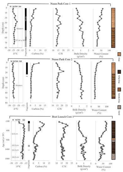 Of the measured proxy indicators that were potentially useful to distinguish salt marsh from mangrove sediments (water content, loss on ignition, bulk density, carbon percentage, δ13C, and plant fragments), four logically change with depth. Loss on ignition and carbon percentages relate to soil bulk density and tend to decline with depth due to decomposition and soil compaction [34]. Our data showed that water content and bulk density are strongly correlated (Table 2) with an inverse relationship (data from Table 1). Declines of organic carbon and bulk density with depth and increases in water content with depth were seen in our core samples (Figure 3). Given that these four potential proxies were strongly related to depth down the soil profile as opposed to marsh vs. mangrove sediment input, they have limited utility in allowing discrimination between salt marsh and mangrove sediments in core deposits. Therefore, the best proxy indicators that we employed for distinguishing mangrove and salt marsh deposits included a combination of δ13C values of sedimentary organic matter and plant fragment information.