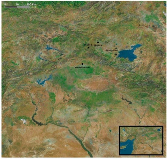 - Robin, A.K.; Mouralis, D.; Akköprü, E.; Gratuze, B.; Kuzucuoğlu, C.; Nomade, S.; Pereira, A.; Doğu, A.F.; Erturaç, K.; Khalidi, L. Identification and characterization of two new obsidian sub-sources in the Nemrut volcano (Eastern Anatolia, Turkey): The Sıcaksu and Kayacık obsidian. JAS Rep. 2016, 9, 705–717. [Google Scholar] [CrossRef]