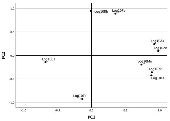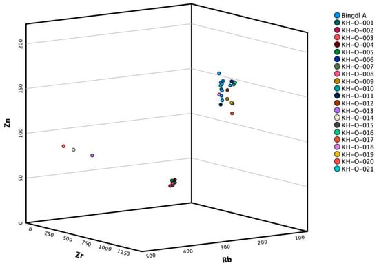 While multiple bivariate scatterplots are generally used for obsidian-source assignment, principal component analysis (PCA) has been suggested to identify compositional groups in a dataset [,,,,,,]. In this study, we applied PCA to characterize archaeological samples and define compositional groups. The data of archaeological samples and geological samples from Bingöl A were transformed to base-10 logarithms before PCA to reduce the differences in magnitudes of the concentrations recorded and address the skewness of the original data [,]. In contrast, other data-transformation methods include Z score standardization [], multivariate Box–Cox transformation [], and a minimum/maximum normalization []. PCA was performed using a correlation matrix with no rotation axis. A ratio plot of Fe/Mn vs. Rb/Zr and a ternary graph of Zr, Rb, and Zn are also used to distinguish peralkaline and calc-alkaline obsidian artefacts. In this study, multivariate statistical analysis is carried out with the help of SPSS software 28.0.1.0 (142) (IBM 2021).