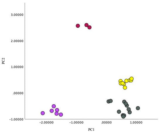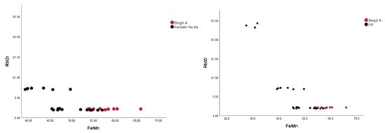 The Fe/Mn vs. Rb/Zr scatterplot of the samples discriminates three geochemical groups (Figure 11). One group closer to Bingöl A reference samples represents the peralkaline obsidians at Kendale Hecala; however, we understand that there is an overlapping between Nemrut Dağ obsidian, especially between Sıcaksu and Bingöl A []. On the contrary, the scatterplot of principal component analysis is more efficient to discriminate between two peralkaline sources. The artefacts assigned to Bingöl B are separated from peralkaline obsidian, while three artefacts identified as Group 3d appear on the upper left corner of the plot, is notably differentiated from the other artefacts. This pattern is related to a significantly higher concentration of Rb.