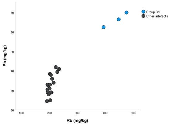 The second principal component distinctively separates Group 3, including three artefacts. The discriminating positive loading of Pb and Rb elements is interesting since it suggests that these artefacts were produced from Group 3d obsidian. In a Rb vs. Pb scatterplot, which was recommended for assigning Group 3d obsidian [], three artefacts (KH-O-013, 014, and 020) exhibit significantly higher values of Rb and Pb (Figure 9). The Pb content with a mean of 66 ± 4.54 ppm (mg/kg) obtained by Campbell et al. [] for the artefacts defined as Group 3d is consistent with our data. The mean concentration of Rb is 439 ± 42 ppm corresponds to values that have previously been published [,,], while the Rb content of KH-O-013 is relatively lower. However, it is compatible with the data of four artefacts from Yarım Tepe II obtained by Francaviglia using XRF [] (see also []), and one sample from Eridu reported by Renfrew [].