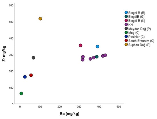 Group 4, consisting of six artefacts, is separated for its higher Ca and Ti values in Figure 6. In the Ba vs. Zr scatter plot, our data for Group 4 are compared to published values in order to define the geological source of the samples (Figure 10). Group 4 artefacts have a Ba content ranging from 317 to 431 ppm, while their Zr content is between 268 and 291 ppm. Therefore, the element composition of this group corresponds to Bingöl B source.