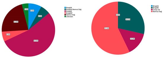 Kenan Tepe is the only settlement so far that the large-scale use of this compositional group has been detected []. Due to the intensive use of Group 3d and on-site production, the authors proposed a possible location of Group 3d as more accessible to Kenan Tepe, probably between Nemrut Dağ and Bingöl area. When we compare the proportion of Group 3d artefact among the other sources, the ratio of Group 3d artefacts is 14% (Figure 13). On the other hand, obsidian assemblage at the site indicates on-site production, regardless of obsidian type. However, the number of obsidian artefacts was limited in our study since the sampling was undertaken at the earlier stages of the excavation. Future studies will produce data to better understand the obsidian chaîne opératoire at Kendale Hecala during the Ubaid period.