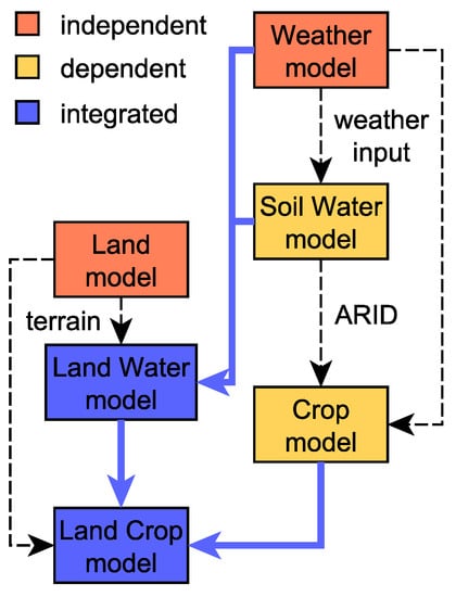 Currently, all Indus Village submodels are designed and, at least partially, implemented. However, the present article covers only the first set of milestones in the modeling program, involving the weather, soil water, land, and crop models, whose implementations are fully consolidated and united in the form of two integrated models (Figure 1). The Indus Village submodels are intentionally designed as modules, meaning they can function independently as models, if the required input is given. More concretely, the weather and land models are fully independent modules, with no input required, while the soil water and crop models need the input of either the weather model or a daily weather time-series dataset. Our hope is that modularity, besides enforcing greater code stability and extensibility, will also encourage the reusability of these submodels in the future. The reusability of the Indus Village as a whole is also further potentiated since individual modules can be modified or even replaced as long as the required input–output connections are attended.