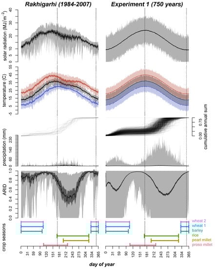 Summary statistics of weather variables and ARID per each day of year in (1) experiment 0, using data from Rakhigarhi, Haryana, India, between 1 January 1984 and 31 December 2007 (source: NASA POWER), and (2) experiment 1, corresponding to the simulation of 750 years (365 days). Means are solid lines, 95% Student’s t-confidence interval are dark areas, and ranges between maximum and minimum are lighter areas. The growing seasons of the crops selected are plotted in relation to both datasets.