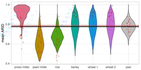 Mean ARID during each crop growing season and the entire harvest calendar year, as generated in experiment 0 (red points) and 1 (distribution shapes). The strong horizontal lines mark the average value of annual means for each dataset (red: experiment 0; black: experiment 1).