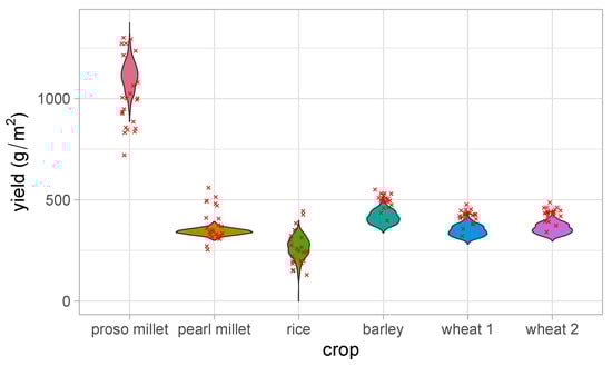 In contrast, proso millet exemplifies a different source of yield inconsistency. Being a C4 plant with a shorter growing cycle and parametrized with a distinctively high radiation use efficiency (), this crop can take more benefit from the summer peak in solar radiation and temperature, producing the highest yield of the six selected crops. However, proso millet also presented the largest inconsistency in yield, exactly because it endures the hottest months of the year. Its growing season displays higher and, more importantly considering it has a low , higher daily temperature maxima. Days with such high maximum temperature are more likely to cross the crop’s thresholds of tolerance to heat (, after which biomass growth declines linearly, and , where growth stops completely. While proso millet yield reaction to mean during growing season is negligible (Pearson’s ), its response to the mean daily maximum temperature of the period is considerable (Pearson’s ). Pearl millet, the most similar crop within the selection, is also more sensitive to mean daily maximum temperature, yet it is affected by it as a positive factor (Pearson’s ), given its growing season being set later in the year. Even though both proso millet and rice yields are more variable than those of the other crops selected, the variance in rice is more alarming from the perspective of a small producer, since bad years will more likely produce yields closer to zero.