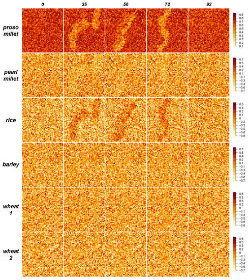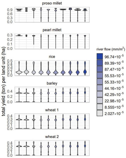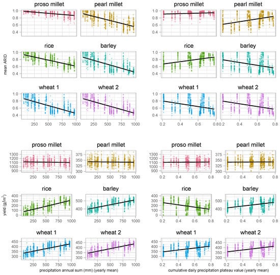 The results of experiment 2, varying both the annual sum and the winter–summer balance of precipitation, further help to illustrate the complex implications of seasonality (Figure 5). While lower mean annual sums will generally correspond to higher mean during every growing season, this effect is distinctively less pronounced during the zaid season, when there is normally little precipitation under high evaporation conditions (Pearson’s for proso millet, compared to for pearl millet, for rice, and for wheat).