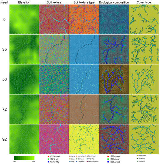 While all five terrains received additional flow accumulation in one land unit at the northern edge during the generation process, only terrains 35, 56, and 72 effectively contain a passing river due to their favorable relief. Regarding soil texture, terrains 0, 72, and 92 have soils with considerably higher sand fraction, dominated, respectively, by loamy sand (0), sandy clay (72), and loam (92); while terrains 35 and 56 have a greater percentage of silt and clay, classified overall as silty clay. Terrains 0 and 92, though dominated by sandy soils, contain spots with higher concentrations of silt and clay in and around drainage branches, in proportion to the local flow accumulation. Regarding the ecological communities covering terrains, wood and brush components are generally present along most drainage branches in all terrains, forming differentiated riparian communities characterized by woody vegetation (i.e., woodland and shrubland cover types). Land units positioned higher in the water flow chain have less wood and brush, and more grass, though falling still within the intermediate wood-grass cover type. The five terrains differ significantly in the overall distribution and balance of ecological components; e.g., terrain 0 is covered continuously by a single homogeneous brushy community, while 92 displays clear borders between woody and grassy communities.