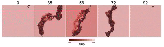 The soil water model is next in simplicity to the weather model. It describes the flow, retention, and drainage of water through the soil of land units. This model is an adapted version of the ARID soil water model, which, thankfully, has already been fully implemented in R and documented [39] (pp. 24–28, 138–144). It is a relatively simple model that calculates the daily water content of a single homogeneous layer of soil, determined by a given rooting depth, and is thus dependent on the vegetation considered. It requires the daily water input, including precipitation, and temperature, which is used to calculate the daily reference evapotranspiration. The targeted outcome is the Agricultural Reference Index of Drought (ARID) [40], which is a coefficient expressing the level of water stress in the soil in a scale typically ranging between 0 (none) and 1 (maximum stress, though the value can be higher if soil water level is lower than the plant wilting point). The soil water model was implemented in NetLogo together with the weather model so that it could remain independent of any given dataset.