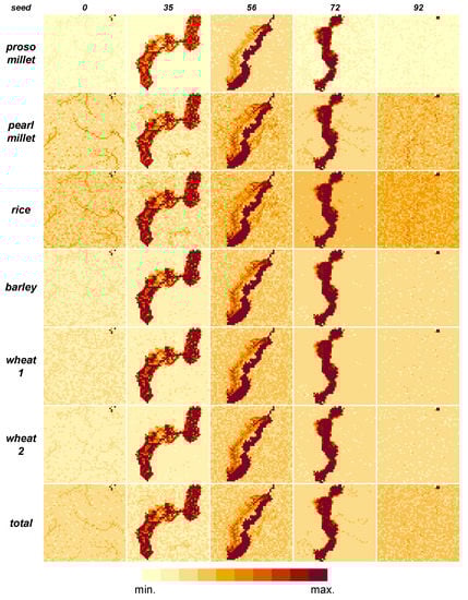 Following the SIMPLE approach, crop diversity takes form in the configuration of a relatively small number of parameters (Table 2). These are set in an external file (“CropTable.csv”) and imported during initialization. Crop selection and parametrization is not a fixed aspect of the model and can be easily changed by editing this external file. The crops selected for the experiments presented in this article are limited to six cereals. However, the crop model inherits the flexibility of SIMPLE and could (and will) be used with other crops identified in IC contexts (e.g., pulses). Additionally, the crops selected are not controlled by empirical data on ancient cultivars of the Indus River Basin. Instead, they represent archetypes of cereal crops identified so far in the archaeological record, which might have had a significant role in throughout the Mature Harappan [13]. These crops were also selected to cover a range of meaningful parameter diversity within SIMPLE’s definitions. Even though not calibrated, values are informed by crop modeling systems and crop-specific studies [41,42,43,44,45,46].