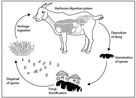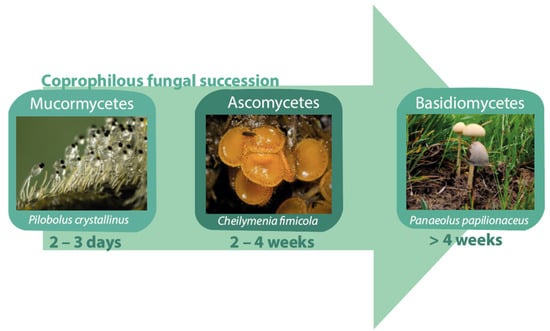 Over the past decades, our understanding of complex fungal successions has developed []. Initially, it was postulated that fungal succession was a function of nutrition [,]; however, this was disproven in 1964 by Harper and Webster [,], and it is now believed that various life cycles of fungi control the succession of coprophilous fungi [].