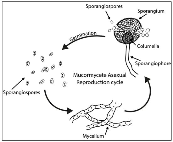 Generalised mucormycetes’ asexual reproduction cycle (adapted after Bell []). Sporangiospores are the spores produced inside the sporangium which is a cell of a fungus which contains spores. The sporangiophore is the stalk of the sporangium and the columella is a column of sterile tissue which bears spores.