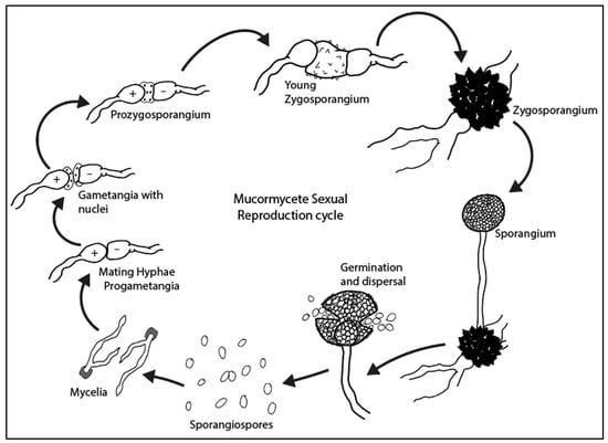 Heterothallic Mucormycetes species have two sexual hyphae, which grow together []. The hyphae apex is fused through the formation of progametangia once trisporic acid, a pheromone compound, is produced []. Subsequently, the progametangia become the gametangia when the apex fuse; this is followed by the septum separating the apex []. After the septum disintegrates, the nuclei in the cell are fused creating the prozygosporangium, which enlarges into zygosporangia []. These then form hyphae, and after germination, produce germ sporangia []. Germ sporangia often contain both mating types of sporangiospores [], thus completing the negative feedback loop (Figure 4). The sporangiospores are then ejected through various mechanisms that are dependent on the species and the environment [,], but are likely dispersed through the air [].