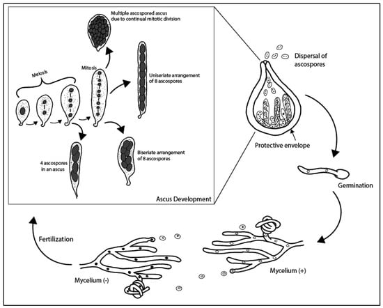 The life cycle of Ascomycetes species can vary; however, the general pattern is shown in Figure 5. Once an ascospore germinates, a mycelium forms []. The nuclei in the spore divide and the hypha grow, branching off in some places []. Fertilization is then possible if there are two opposing mating types; the male nucleus is retrieved by the female nuclei or ascogonium []. From this, the hymenium is created in which ascospores are produced [] (Figure 5).
