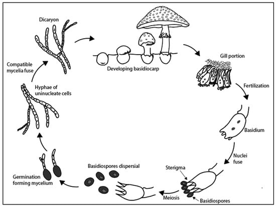 A characteristic that makes Basidiomycete fungi so different to other classes is their production of basidiospores on the outside of the basidium (the body that produces the spores) (see Figure 6) []. The formation of basidiospores is similar to that of ascospores []. The basidiospores are powerfully exerted from the basidium, where they are then able to germinate and form mycelium with hyphae of uninucleate cells []. Next, the cytoplasm within the cells, from two compatible mycelia, fuse to form a dicaryon (cell with two nuclei), which results in a binucleate cell [,,]. This then divides, forming a binucleate mycelium that fruits from the hyphae []. The fusion and meiosis of the hyphae creates the basidia, on which there are sterigmata where the basidiospores form on the outside (Figure 6) [,]. Once spores are released, if they find themselves on suitable substratum, they will germinate [] and the cycle continues (Figure 6).
