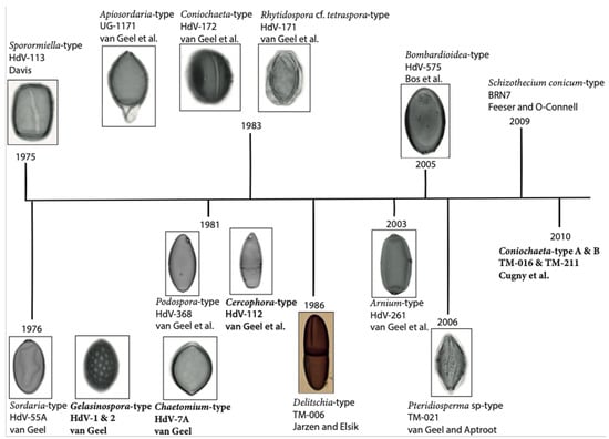 The pioneering work of B. van Geel and co-workers at the University of Amsterdam led to the incorporation of NPPs in traditional (pollen and fern spore) palynological studies []. The microscopic analysis of many sub-samples extracted from many sedimentary records resulted in hundreds of fungal types being identified. This led to a paradigm shift in palaeoecological research as the huge increase in indicators allowed previously unseen aspects of past ecosystems to be reconstructed []. The process of categorizing and establishing NPPs as palaeoecological proxies was, and remains, necessarily interdisciplinary, gaining contributions from zoology, mycology, phycology, and plant anatomy []. In some cases, fungal spores extracted from sediments can be given genera names that are associated with their modern-day equivalent []; however, other fungal spores cannot be reliably attributed to modern equivalents, and these unidentified types are therefore given a type number that follows the location where they were first identified [].