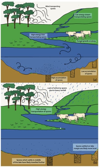 Although the majority of fungal spores will be deposited and germinate in the local surroundings of their source [,,,], some may travel further [,]. Spores can be transported through three means: the air (Figure 9a), hydrological mechanisms (Figure 9), or animal migration [,]. The most likely mode of transportation for SCF typically considered in palaeoecology studies is water, through rivers and surface runoff [,]. Van Geel [] has shown Kretzschmaria deusta to be a useful indicator of runoff events []. Other SCF types, such as Basidiomycete fungi, which mainly travel through air [], are often not preserved or recovered from sedimentary samples. The means of transportation of SCF is usually dictated by the species morphology [], with round and oval spores dispersing in a similar fashion to pollen [].