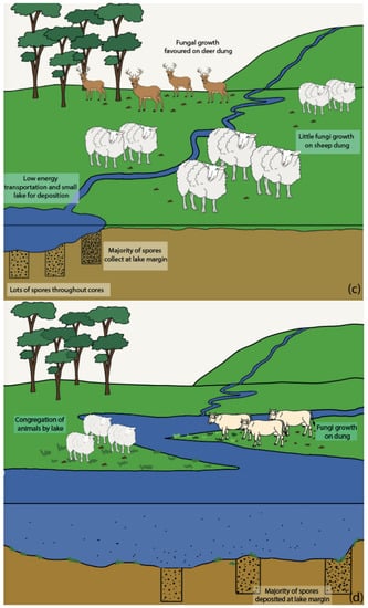 Coprophilous fungi are able to grow on a wide range of faeces; however, some fungal types are more likely to grow on the dung of specific herbivore species [,,]. For example, Coprinus stercoreus is commonly found on sheep, cattle, deer, and rabbit dung, while Ascobolus carletonii has been reported to grow exclusively on grouse dung []. Consequently, certain herbivores will facilitate the growth of coprophilous fungi more than others, which could cause an inaccurate reconstruction of the abundance of megaherbivores present at that time []. For example, a small population of deer could contribute more to the fungal record than a larger population of cattle [,] or sheep, as seen in Figure 9c. Reasons for this variation in growth have often been neglected in the interpretation of SCF datasets. Even though the factor of some spores being more abundant in specific animal dung should be considered, its overall influence on reconstructions is likely to be little. This is because it is not possible to identify SCF to the species level and many species within the same genus grow on different herbivore dung. Thus, the different contribution of SCF growing on the dung of different herbivore species cannot be recognised in the sedimentary records, although other types of SCF, such as the Coprinus type (class Basidiomycetes), do not favour a specific dung type []. Therefore, these fungal types have the potential to be unbiased indicators of historic megaherbivore abundance. However, it should be noted that Basidiomycetes are rarely found during analysis [,], either because they do not preserve well in sediment or are lost during sample preparation (see Section 4.1). Our understanding of the relationship between herbivores, their surrounding landscape, and how this is reflected in the fossil fungal record needs further study [].