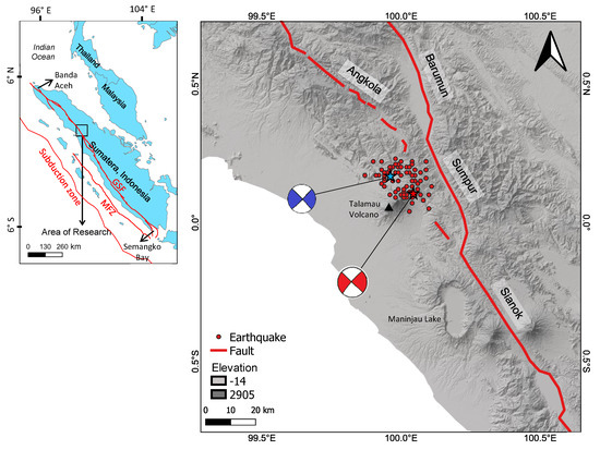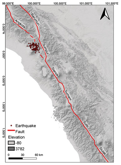 The Pasaman area has four main active fault segments, namely, Barumun, Angkola, Sumpur, and Sianok. Moreover, there is also a Talamau segment that is categorized as an uncertain fault by the Geological Map produced by Rock, N. M. S. et al. (1983) [40]. The slip rates of fault segments covering the Pasaman are 23 ± 4 mm/y [7]. The Sumatra subduction zone is responsible for the high slip rate in the Pasaman area, including the activities of the Barumun, Angkola, Sianok, and Sumpur segments. Because of such complex tectonic conditions, the Pasaman area experienced earthquakes in 1977 and 2022. The 1977 earthquake (magnitude 6.1) occurred near the Angkola segment [63], while the 2022 earthquake (magnitude 6.2) was in close proximity to the Sianok, Sumpur, and Angkola segment faults. On the other hand, the BMKG catalog shows that the Talamau uncertain fault did not have any seismic activity before the 2022 Pasaman earthquake.