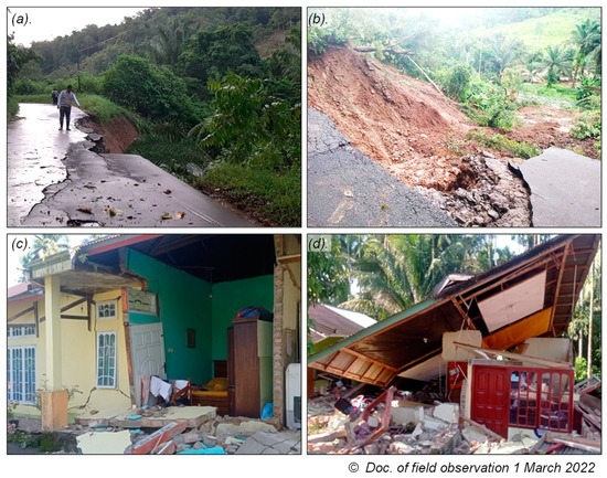Damage of the Pasaman earthquake: (a) landslide, (b) road damage, and (c,d) building structural damage.