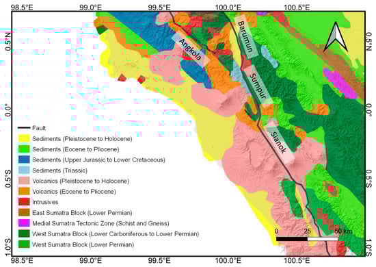 The Pasaman area is constructed by a complex variation of rocks [9,41] (Figure 3). This area is crossed by the Central Sumatra Fault Zone (consisting of Barumun, Angkola, Sumpur, Sianok, Sumani, Suliti, and Siulak segments) as part of the GSF (Figure 4). Particularly, the oldest stage (Permian–Cretaceous) is represented by intrusive and metamorphic rocks (from diorite to granite and low-grade to high-grade, respectively). The middle stage (Eocene–Pliocene) predominantly consists of intrusive (i.e., harzburgite, pyroxenite, dunite, diorite, granite) and volcanic rocks (i.e., lava and pyroclastic deposits), volcaniclastic and pelagic sedimentary rocks (i.e., breccia, sandstone, shale stone), and limestones. The youngest stage (Pleistocene–Holocene) mainly includes alluvial and volcanic deposits (from basaltic andesite to rhyolite), originating from the Talamau, Malintang, and Sorikmarapi Volcanoes. Most of these rocks are cut by (at least) three fault segments of the GSF, namely, the Angkola, Barumun, and Sumpur segments. By contrast, there has been no report on fault segments around the vicinity of the Talamau Volcano.