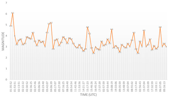The displacement field observed around the fault is heavily impacted by the dimensional and temporal patterns of earthquake moment release. Seismologists have been able to depict the time-space genesis of earthquake ruptures documented by neighboring detectors in astonishing detail [42,43]. Long-period teleseismic body waves that exhibit complex waveforms can be used for understanding the displacement field near the fault [44]. Pacheo et al. (1989) [45] investigated the features of the sourcing process in the 1988 Armenian earthquake using wideband and long-duration teleseismic records. We used a developed multiple-event deconvolution technique to examine teleseismic body waves due to source variety that may have an immense impact on the dangerous power of an earthquake and the nature of coseismic deformation in a diverse tectonic context. We used teleseismic wave data to look deeper at the rupture process of the 2022 Mw 6.1 Pasaman earthquake, which started with an M4.9 foreshock followed by 201 aftershocks (Figure 5). The Data Management Center of the Incorporated Research Institutions for Seismology (IRIS) was used to connect 54 broadband stations in the Global Seismographic Network and the Federation of Digital Seismograph Networks. As far as azimuthal exposure is concerned, the observatories’ epicentral distances are between 30° and 90° kilometers (Figure 6).