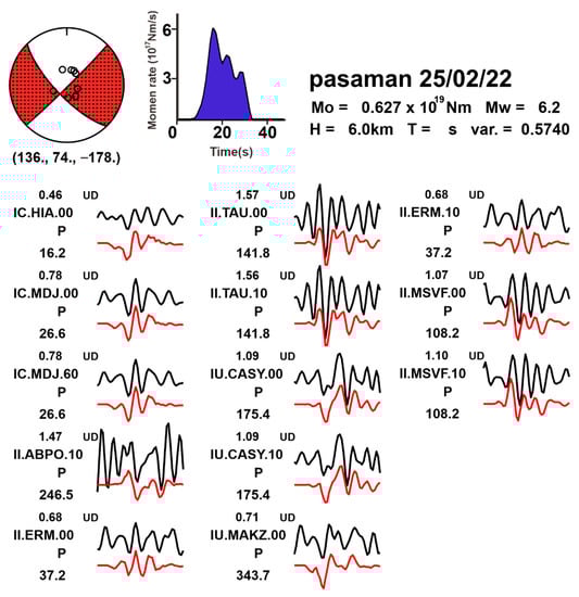 Moment rate function, focal mechanism, and comparison of observation data (black line) and synthesis data (red line) at seismic stations used in the Pasaman earthquake inversion analysis. The small ball on focal mechanism shows the number of recorded seismic stations, red for the compression zone and white for the dilation zone.