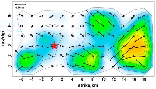 The results reveal that the greatest slip at the source is 1.01 m. The slip vector is downward in the slip distribution, with the biggest slip in the largest asperity zone. The hypocenter is the point or line in the lithosphere where an earthquake occurs. In Figure 9, the asperity is to the southeast of the earthquake hypocenter on the down-dip section. The fault’s plane’s first rupture occurs at the initial break (or the hypocenter). The most significant energy release of an earthquake occurs in the area of greatest asperity, not in the first rupture of the earthquake [61].