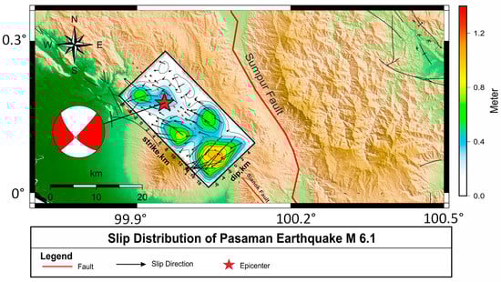 The hypocenter is not in the maximum asperity zone, which is located at 16 km in the dip direction and 0 km in the strike direction from the hypocenter. The length of the line shows it from the slip point, with its size reaching 1.01 m. The major asperity in the inverted fault’s position is not in the initial break. As a result, the most significant energy release occurs near the fault area’s highest asperity, which is located in the southern part of the original break. According to the teleseismic inversion results, the coseismic deformation of the 2022 Pasaman earthquake was generated by regional tectonism, which was localized along the Sianok fault and then spread to the north and reached the uncertain fault segment in the Talamau area.