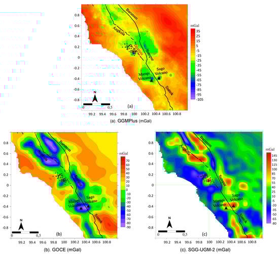 (a) GGMplus SBA, (b) GOCE SBA, and (c) SGG-UGM-2 SBA. Faults are symbolized by a black straight line, volcanoes are represented by a black triangle, a red dotted line symbolizes the inferred Talamau fault, and red dots illustrates aftershocks distribution.