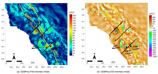 Figure 11a shows the FHD gravity anomaly of GGMplus in the range of 0–160 mGal. Several places, such as the Marapi Volcano, the Sago Volcano, the border between Lake Maninjau and the land around it, the Volcanic Formations, and the West Sumatra Block, are shown with high anomalous zones. On the other hand, the GSF, in the FHD anomaly, shows a low anomaly pattern, which extends from north to south, ranging from 0–25 mGal.