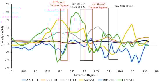 The AA′ and BB′ slices are positioned perpendicular to the supposed Talamau segment until they cross through the Sumpur segment as part of the GSF. In the red box, the estimated area of the Talamau segment on slice AA′ is about 0.3–0.33° away, with a maximum FHD anomaly value of approximately 25 mGal. For the slice BB′, it is nearly 0.21–0.24° away, with a maximum value of nearly 15 mGal. On the other hand, in the black box, the slice AA′ is placed at a distance of 0.4–0.44° with a maximum anomaly value of ∼16 mGal. The slice BB′ is positioned at a distance of 0.28–0.33° with a maximum anomaly value of approximately 14 mGal. The slice CC′ is perpendicular to the Sianok segment. The black box slice CC′ defines the region indicating the presence of the Sianok segment, which is 0.28–0.34° away and has a maximum value of approximately 85 mGal, as it is located between two volcanoes. The segment distance between Sianok on the CC′ slice and Sumpur on the BB′ slice is nearly identical. The cross-section shows that the slice with the highest FHD value shows a geological feature in the form of a fault segment.
