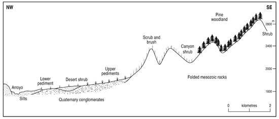 The vegetation patterns reconstructed at the Upper Arroyo pollen site in the Late Holocene are thus suggestive of the increasing importance of local physiographic in addition to climatic processes in the development of the Chihuahuan desert flora. These physiographic factors include the denudation of the soil organic content, the reduction in the hydration of floodplain soils, and the establishment of xerophytic ecological niches. The latter niches include steepening slope parameters and soil erosion in piedmont and highland zones on a local basis, enhancing the competitiveness of tree species that grow on steep, rocky substrates, such as Pinus edulis, as well as a wide range of desert succulents on floodplains ([,], cf. Figure 3 and Figure 12). Significantly, there is no evidence for the importance of human land use as a major factor in vegetation development before modern times in southern Coahuila, with only localized horticulture being evident during prehistory []. Indeed, the Chihuahuan Desert’s formation began eight millennia before the Spanish Colonial period in northeastern Mexico.