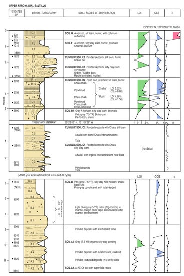 - Butzer, K.W.; Abbott, J.T.; Frederick, C.D.; Lehman, P.H.; Cordova, C.E.; Oswald, J.F. Soil-geomorphology and “wet” cycles in the Holocene record of North-Central Mexico. Geomorphology 2008, 101, 237–277. [Google Scholar] [CrossRef]