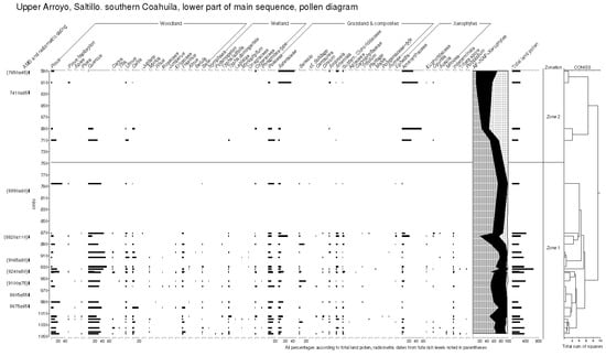 The processes of desert formation in the Chihuahuan Desert of northern Mexico during the Holocene are the subject of this alluvial pollen study of a 10.5 m-deep exposure at Upper Arroyo, a seasonally dry, now impounded river within the city limits of Saltillo in southern Coahuila (Figure 1). In this work, data from 76 pollen samples, 27 radiometric dates, and context sedimentology data were considered in the reconstruction of vegetation and environmental changes during the past 10,000 years. These changes were considered both with respect to inter-regional factors, such as climate changes, as well as more local physiographic changes involving erosion, accumulation, soil development or denudation, land use, and other agents of environmental changes. These processes are expressed in flora through zonal (elevation) and azonal ecological niches that have important ramifications for the long-term phylogenetic development of the Chihuahuan Desert flora [,].