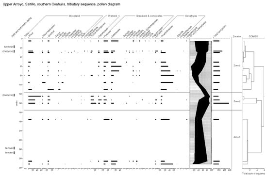 In the current study, pollen samples were obtained from alluvial accretion sediments exposed in profile within the floodplain of Upper Arroyo, adjacent to a Spanish Colonial diversion dam (Figure 2). Based upon the pollen-recruitment characteristics of the alluvial sites [,], as well as experience in analyses of such sites in Subtropical Mexico and Texas [,], and the temperate continental lowlands of East Europe [,], it is expected that vegetation reconstruction at Upper Arroyo will reflect both the regional, zonal vegetation changes, including the development of desert flora in the Saltillo basin itself, and changes reflective of more local, physiographic processes in the floodplain that cross-cuts different altitudinal zones.