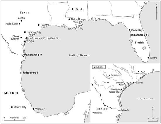 The potential growth of mangrove trees (mangle) at the examined pollen sites was established through the use of pollen analogs, with the ultimate aim of reconstructing relative tropical influence at examined pollen sites. These mangrove tree analogs included two sites where stands of Avicennia (cf. germinans) native to Texas were found and two sites consisting of stands of Rhizophora (cf. mangle) native to tropical Mexico and Florida. Importantly, Rhizophora mangle is excluded from the TGCP today due to climatic requirements, including the poor frost-resistance of this species. The actual presence of these taxa, found in sediment cores in the past vegetation of the study region, was ascertained by sediment surface samples collected from present stands. From the perspective of climate reconstruction, a presence of Rhizophora indicates a more tropical regime and, inferably, a major shift in the boundary of the Intertropical Convergence Zone in the past, with the exclusion of freezing conditions in winter weather (patterns driven by jet-stream drag of Arctic fronts []), with a high sensitivity to temperature conditions in terms of its pollen response []. Surface analogs from four mangrove sites in South Texas, North Mexico and Central Florida were sampled using ten pinch samples of 1 cc volume separated by a minimum distance of 1 m. Mangrove pollen analog sites from widely separated areas were chosen according to the northern distribution limits of the main two genera (Rhizophora and Avicennia):