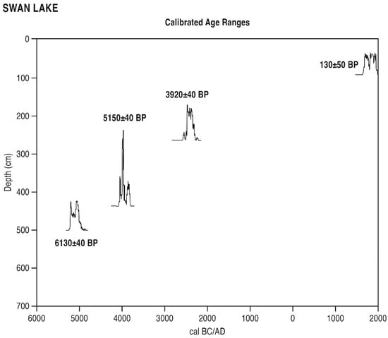 Age–depth graph of probability distributions of individual AMS and standard radiocarbon dates at Swan Lake (SL) pollen site. Linear age estimates for dating of sediments used median calibrated ages.