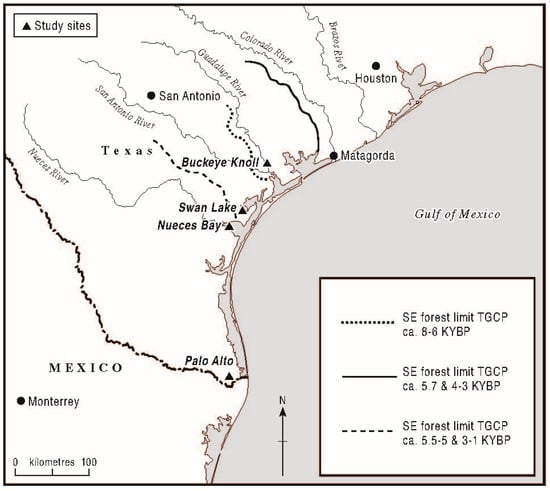 The history of vegetation history research in the TGCP and adjacent regions begins with the palynological work of Larson at the Hershop Bog pollen site in South–Central Texas (Figure 1) []. Wetland conditions at the site are the result of seepage from sandstone reservoirs, and, importantly, the bog itself accumulates pollen mostly from the local bog sub-environment, according to its dimensions, after the aerodynamic model of Jacobsen and Bradshaw []. Within this site, containing only three radiocarbon dates, important finds of Betula pollen of Late Pleistocene age occur in bottom-set sediments. These finds suggest the use of changes in the range of Betula in the tracking of past Texas climate variability, given the present limit of Betula to high-rainfall regions of Texas today []. Also noted is testing work of the author at the pollen site at Palo Alto–Resaca in the Lower Rio Grande valley (Ref. [], Figure 1), at the southern limits of the TGCP. Here, an assessment for the National Park Service of this site showed low arboreal pollen (tree and shrub pollen or “AP”) in the Middle and Late Holocene (please see the Palo Alto pollen diagram supplemental file). The appearance of Carya (cf. illinoiensis) in a sample dating to the 6th millennium BP is significant at this latitude and indicates relatively mesic conditions at this interval. Conversely, a significant increase in xerophytic pollen is notable in the Late Holocene at Palo Alto, as indicated by a rise in Amaranthaceae pollen levels. Further vegetation history records for the TGCP and adjacent regions are also limited, but of note are data of grass phytoliths studied by Robinson for the Choke Canyon project directed by Tom Hester []. Data recovered at archaeological sites in Live Oak and McMullen Counties show two important trends. First is the composition of phytoliths recovered from “Middle Archaic” (4000–3000 BP) sites that contain phytoliths indicating xeric, short-grass flora. Subsequently, “Late Archaic” and “Transitional Archaic” (3000–1500 BP) sites at Choke Canyon contain a different phytolith assemblage that indicates mesic, long-grass flora.