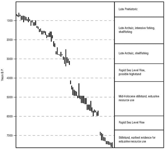 These initial pollen data thus indicate a significant level of variability in coastal marshland ecology during the Holocene, although the palynological assessment may be limited by the poor pollen productivity of deep, freshwater aquatics of strong indicative value (esp. low-salinity indicators, such as Nymphaea and Potamogeton), the isolated presence of which may be important for interpretations, though the absence is not significant. Relative Amaranthaceae provided the strongest indications (of relative salinity) in statistical terms, although a Modern rise in halophytes at NB was not emphatic, according to incremental sum of squares analysis []. Finally, freshwater estuarine development circa 5800 and after 3000 BP, which provides a highly productive biota [], was also correlated with human occupation sites on the TGCP, according to Robert Ricklis (Figure 9), and geologically defined sea-level still stands. The palynological data presented here thus suggest a potential link between the high biotic productivity of estuarine marshes and sea-level still-stand phases in the TGCP during the last 8000 years.