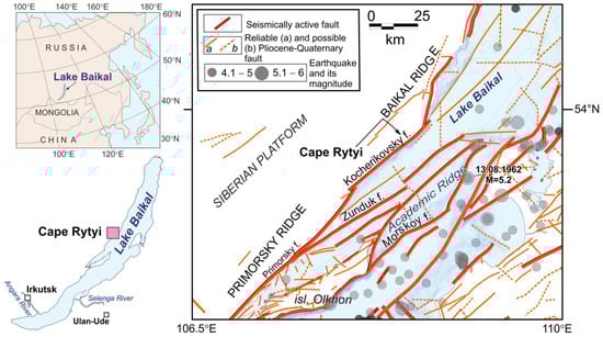 Location map of Cape Rytyi (left) and its tectonic framework (right). Epicenters of instrumentally recorded earthquakes with a magnitude M ≥ 4.1 during 1950–2019, according to [], are shown (labeled date is for the event mentioned in text).