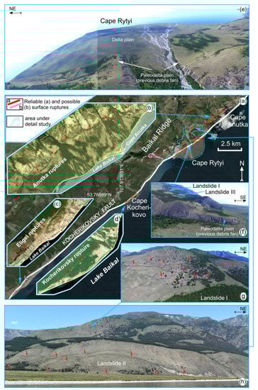 Cape Rytyi is known for its anomalous magnetic field, elevated residual isostatic gravity anomalies [], traces of powerful debris flows, and landslide deformations along seismogenic rupture zones (Figure 2h). From time to time, the GPS signal vanishes in the surroundings of Cape Rytyi, which is reflected in the loss of connection between the unmanned aerial vehicle (UAV) and the control panel, rezeroing the coordinates on the display of a handheld GPS and navigation equipment of the vessel. The yearly freezing of Lake Baikal is regularly accompanied by the formation of a crack parallel to the cape coastline.