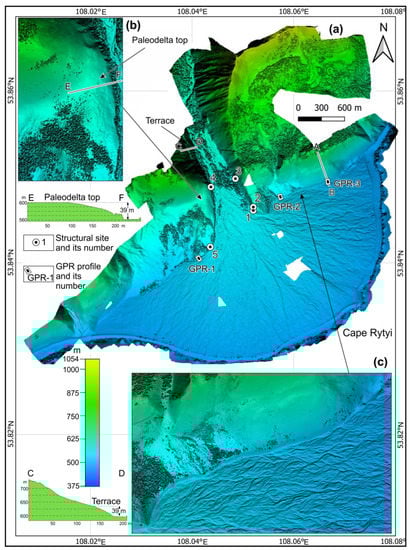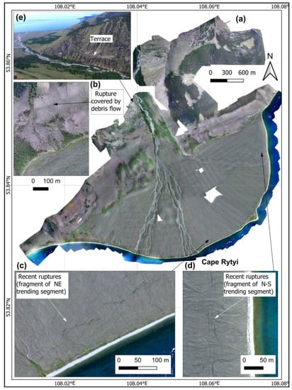 In addition, the Baikal area contains many enigmatic structures, the genesis of which is unclear and attracted the attention of both specialists and laypeople. The purpose of the present work is to study the near-surface geology, geomorphology, and sediment deformations at Cape Rytyi on the northwestern coast of Lake Baikal (Figure 1) and, using this example, to show the possibilities of combining drone aerial photography, ground-penetrating radar (GPR), and structural observations to identify coseismic surface ruptures, determine their relative age in relation to other geomorphological features, and reconstruct of displacements with subsequent calculation of the seismic potential of the active fault, without disturbing the soil cover.