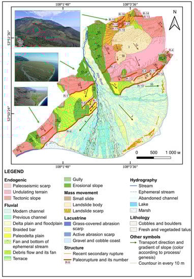 The constructed geomorphological map made it possible to obtain an initial representation of the most prominent morphological features in the vicinity of Cape Rytyi and the occurrence of associated seismic ruptures (Figure 5). Among the morphological features, fluvial and endogenous landforms are the most widespread. The latter are mainly represented by remnants of tectonic slopes, which are abundant in the Baikal Rift []. At Cape Rytyi, they are significantly complicated by denudation and gravitational processes.