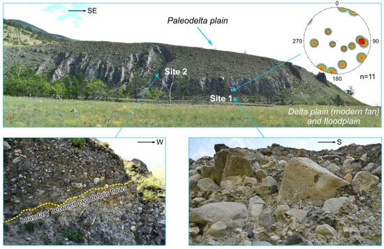 We assume that erosion processes and sediment accumulation intensified at that time, caused by the melting of the mountain glaciers between the western near-top part of the slope of the Baikal Range and its spur. A group of tarn lakes and a swampy area near the source of the Rita River indicates it (see Google Earth maps at the source of the Rita River). The traces of the most powerful floods in the Baikal region occurred 12,000–14,000 years BP [], so the formation of the paleodelta—the previous fan of the Rita River composed mainly of debris flows that carried sediments of various sources—could be tentatively assigned to this period (Figure 14). A single terrace on the right bank of the valley (Figure 3e) might have formed by the end of the same period when, for some reason, the erosion baseline abruptly decreased. The height of the terrace is estimated to be approximately 39 m above the modern valley floor due to its obstruction by slope deposits. It is close to the average ~39–43 m height of the summit zone of the ancient debris flow fan (Figure 4).
